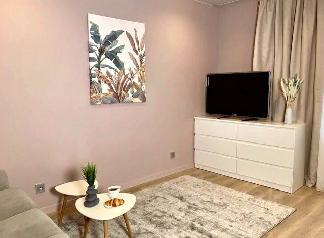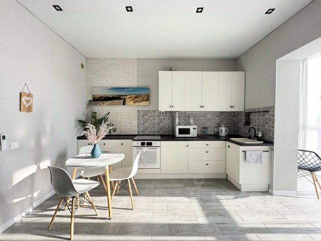 Квартира полностью укомплектована: 2 телевизора (SMART), в спальной и гостиной зоне, бесплатный Wi-Vi, система теплый пол, стиральная и посудомоечная машины, холодильник, электрочайник, встроенная микроволновая печь и духовой шкаф, индукционная поверхность, вся необходимая посуда, утюг, фен.