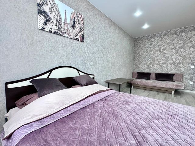 Эта комфортная квартира удобна тем, что имеет большую площадь, в квартире двуспальная кровать и два двуспальных дивана (три раздельных спальных места)