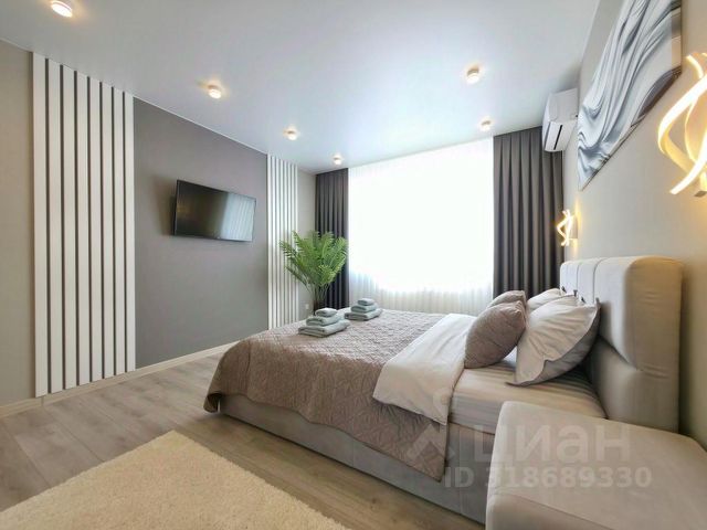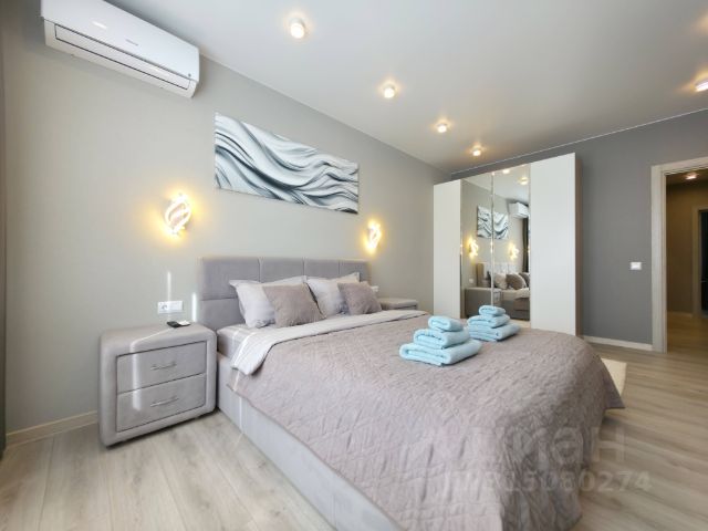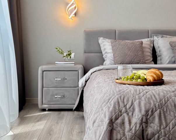 Двуспальная кровать размера KingSize (200*220см). В квартире вся необходимая мебель, в которую можно разложить вещи при длительном проживании. Детская кроватка, предоставляется бесплатно при проживании более трёх дней.