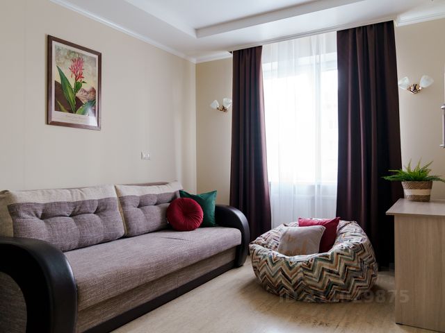 Квартира состоит из изолированной спальни, гостиной, кухни, раздельного санузла и прихожей с встроенными шкафами. В гостиной находится раскладной диван со спальным местом 180x200, телевизор с 200 каналами и функцией Smart TV, обеденный стол и стулья, удобное раздвижное кресло 60x195 с матрасом-топером для сглаживания неровностей, застекленная лоджия, разноуровневое освещение и кондиционер. В спальне установлена новая двуспальная кровать 160x200 с ортопедическим матрасом и подъёмным механизмом, шкаф для одежды, разноуровневое освещение, шторы блек-аут и кондиционер.