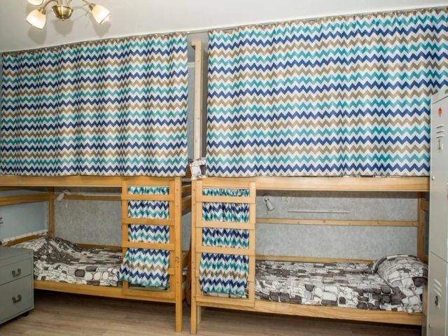Комната на 6 человек. Кровати двухярусные, удобные, широкие, с ортопедическими матрацами и плотной шторкой. Над каждой кроватью светильник, розетки, полочка, крючки для одежды. Имеются металлические шкафчики под ключ. Для досуга есть книги, шустрый wi-fi.