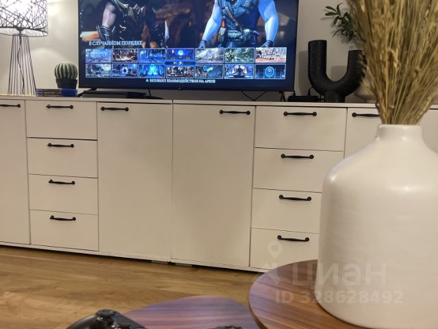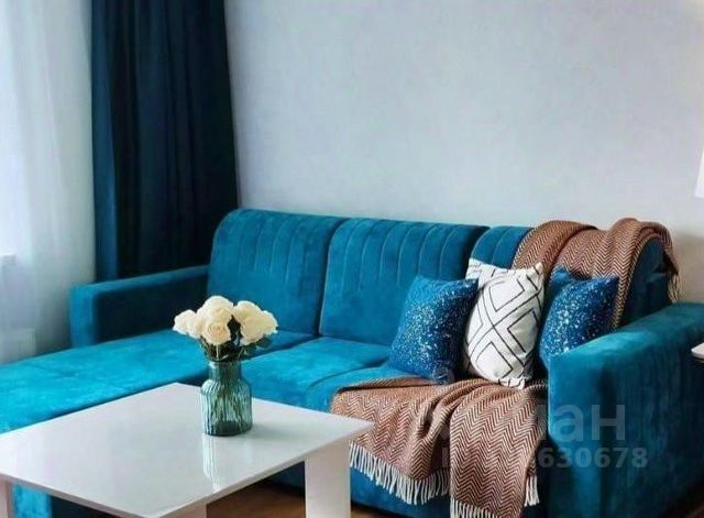 Гостиная: диван-кровать, журнальный столик, пуф, телевизор Яндекс Алиса.