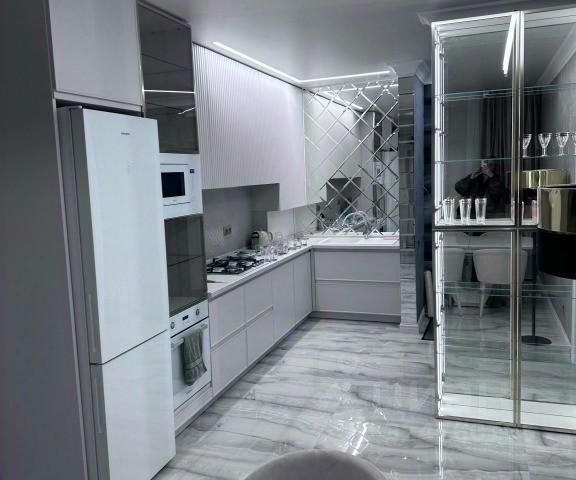 Кухня: холодильник, плита, вытяжка, микроволновка, духовка, чайник, кофемашина, посудомойка, полный набор посуды и приборов