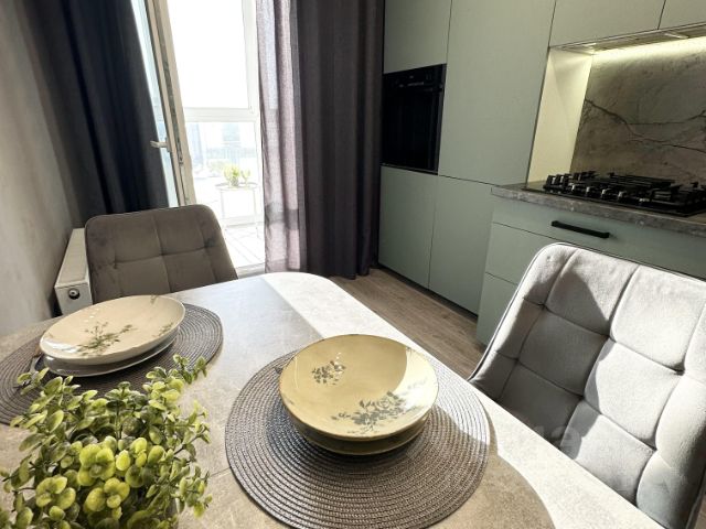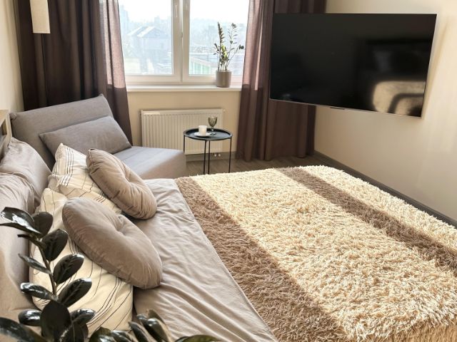 В апартаментах есть всё для комфортного проживания: гостиная с раскладным диваном, Wi-Fi, телевизором с плоским экраном (Smart TV), кабельными каналами и зоной для сна с кроватью (140см на 200см), застекленный балкон, сушка для белья, полностью оборудованная кухня электрический чайник, микроволновая печь, холодильник, плита, духовка, посудомоечная машина, посуда, кастрюли, сковорода, чай, кофе, сахар, соль, перец, ванная комната с ванной, стиральной машиной, феном, жидким мылом, шампунем и бытовой химией, кладовка-гардеробная, постельные принадлежности, полотенца, утюг, гладильная доска.