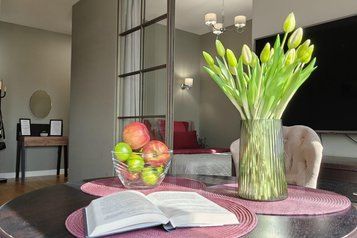 В вашем распоряжении полностью укомплектованная кухня, фильтр с питьевой водой, посудомоечная машина, варочная поверхность, микроволновая печь, стиральная машинка, чайник, тостер, утюг, фен, 2 телевизора, пылесос, сушилка.