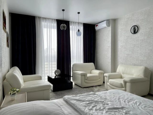 В апартаментах есть все для комфортного проживания 2 человек, возможно размещение 3 человек (диван на кухне шир. 73 см.). Есть отдельная спальня и кухня с зоной для отдыха с диваном, телевизором и столиком для кофе. В спальне светонепроницаемые шторы.