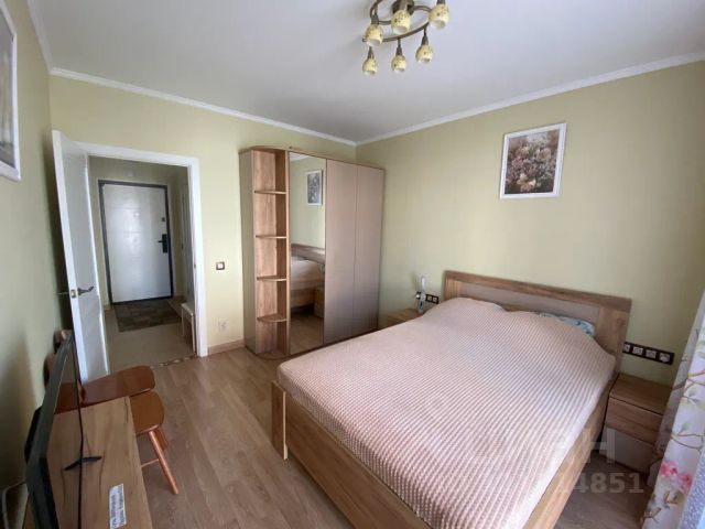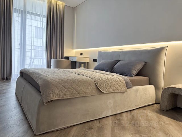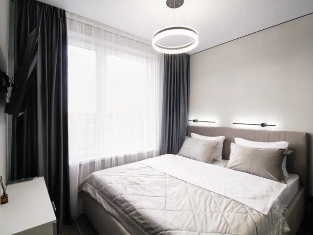 В спальне двухспальная кровать 160х200 см с ортопедическим матрасом и с анатомическими подушками, шторы блэкаут для спокойного сна и телевизор для просмотра любимых фильмов.