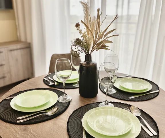 В вашем распоряжении полностью укомплектованная кухня со встроенным холодильником, микроволновой печью, индукционной плитой, кофемашиной, электрочайником, грилем, посудомоечной машиной и всей необходимой посудой и столовыми приборами.