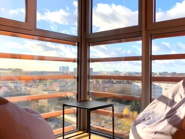 - Панорамные окна на балконе, удобное кресло и журнальный столик, где вечерами можно любоваться закатом.