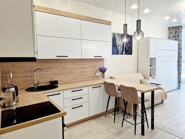 Кухня-гостиная: раскладная кушетка 90*190см, холодильник, микроволновая печь, индукционная плита, эл. чайник, кофемашина, посудомоечная машина, посуда (бокалы, чашки, столовые приборы, сковорода, кастрюля и т.п.), чай/кофе, обеденная зона. Утюг и гладильная доска. Умная колонка SberBoom.