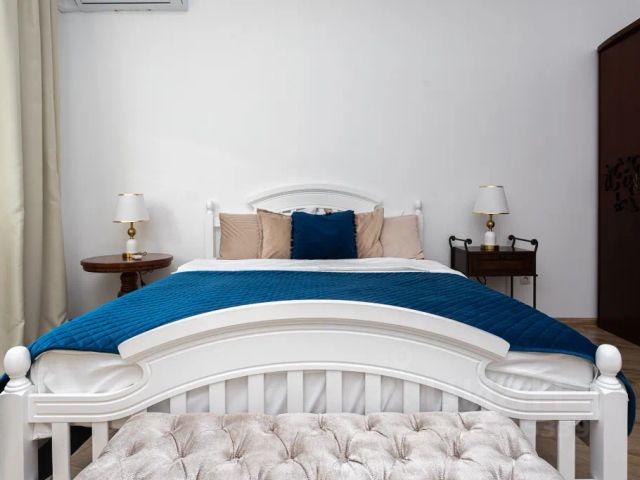 Спальня оснащена двуспальной кроватью 160*200, прикроватные столики и светильники, шкаф для хранения вещей.