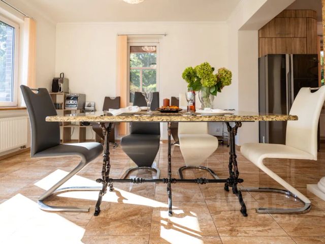 На фото вы можете видеть планировку дома и территории, включающую просторную кухню- гостиную 55 кв.м, оборудованную холодильником, посудомойкой, микроволновкой, духовым шкафом, барная стойка 3м*0, 8м, мягкие кожаные диванчики и дополнительный стол-книжка 1,6м* 0, 8м для семейных и дружеских застолий, 3 просторных отдельных комнаты ( на втором этаже), 2 больших зала, 1 дополнительная гостевая комната ( на первом этаже). в 1-й из комнат на 2 этаже есть большая кровать размером. 2,4м * 3,2м . На 1-м этаже зал с камином . Организовано 14-15спальных мест .На каждом этаже свой санузел душевая кабина ,ванна. Средства гигиены, жидкое мыло, гель для стирки, средство для мытья посуды, таблетки для посудомойки, постельное белье, полотенца( тапочки, халат не предусмотрены), фен, отпариватель.