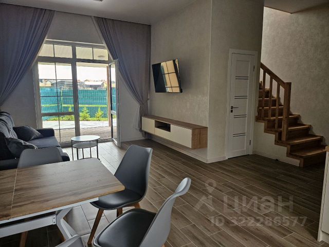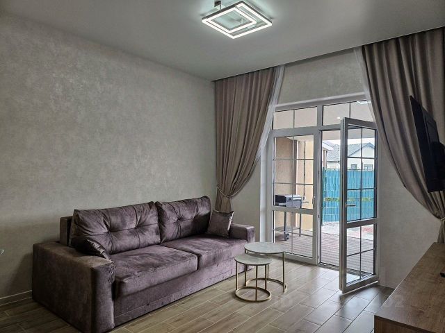 На первом этаже виллы размещены кухня-столовая, туалетная комната, большая терраса и просторная гостиная с камином, угловым диваном и большим телевизором.