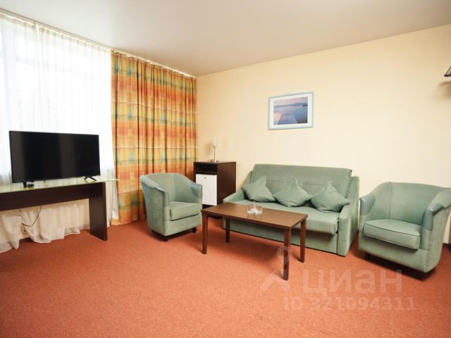 Номер состоит из двух комнат: кухни ,совмещенной с гостиной и спальни, прихожей и ванной комнаты, площадью 50-55 кв. м. Номер меблирован по евростандарту и оборудован всем необходимым для комфортного отдыха.